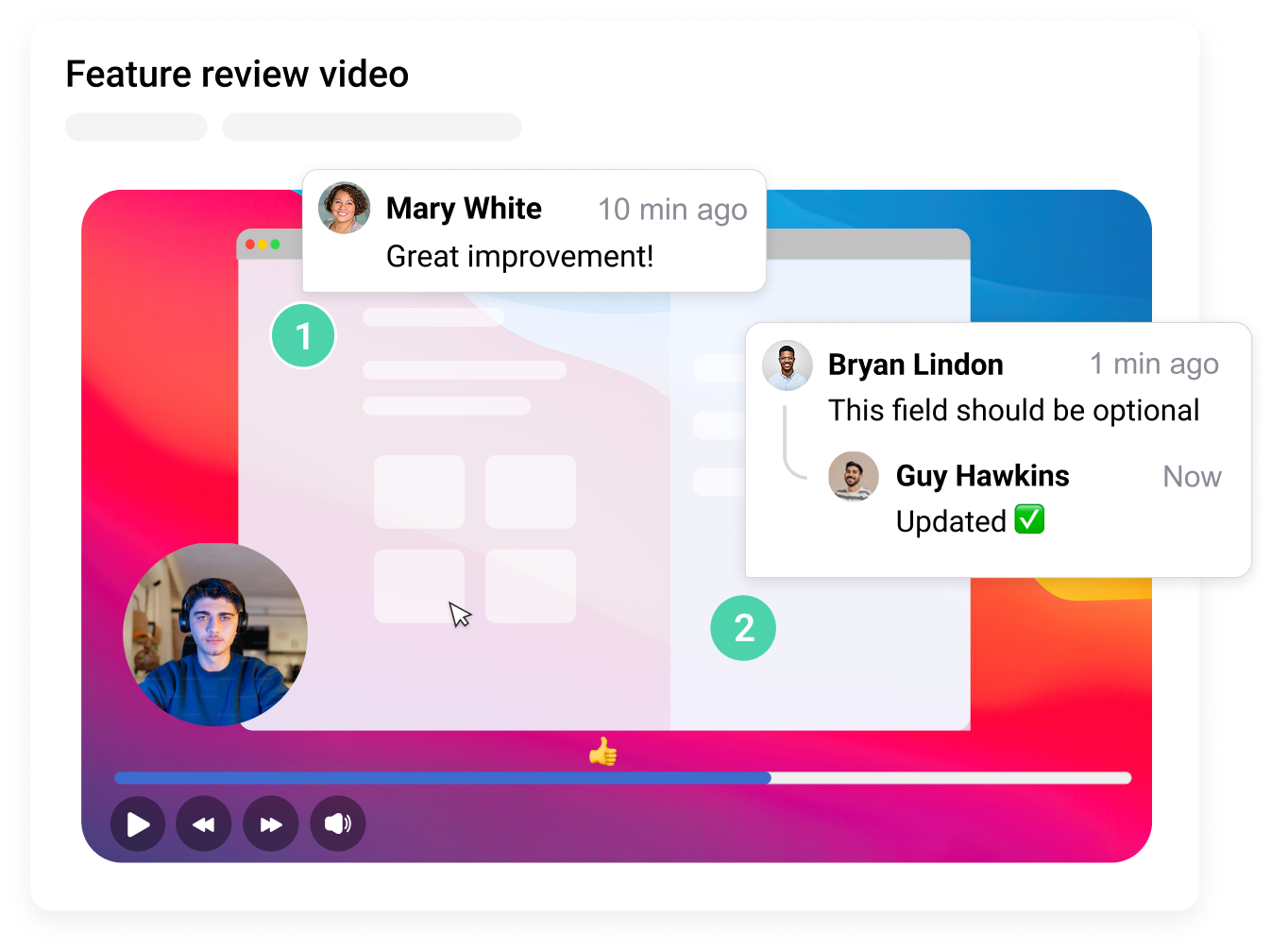 Review PRs and features as they exist and leave comments directly on what needs to change inside the video. Review faster with AI summaries instead of replaying the whole video.
