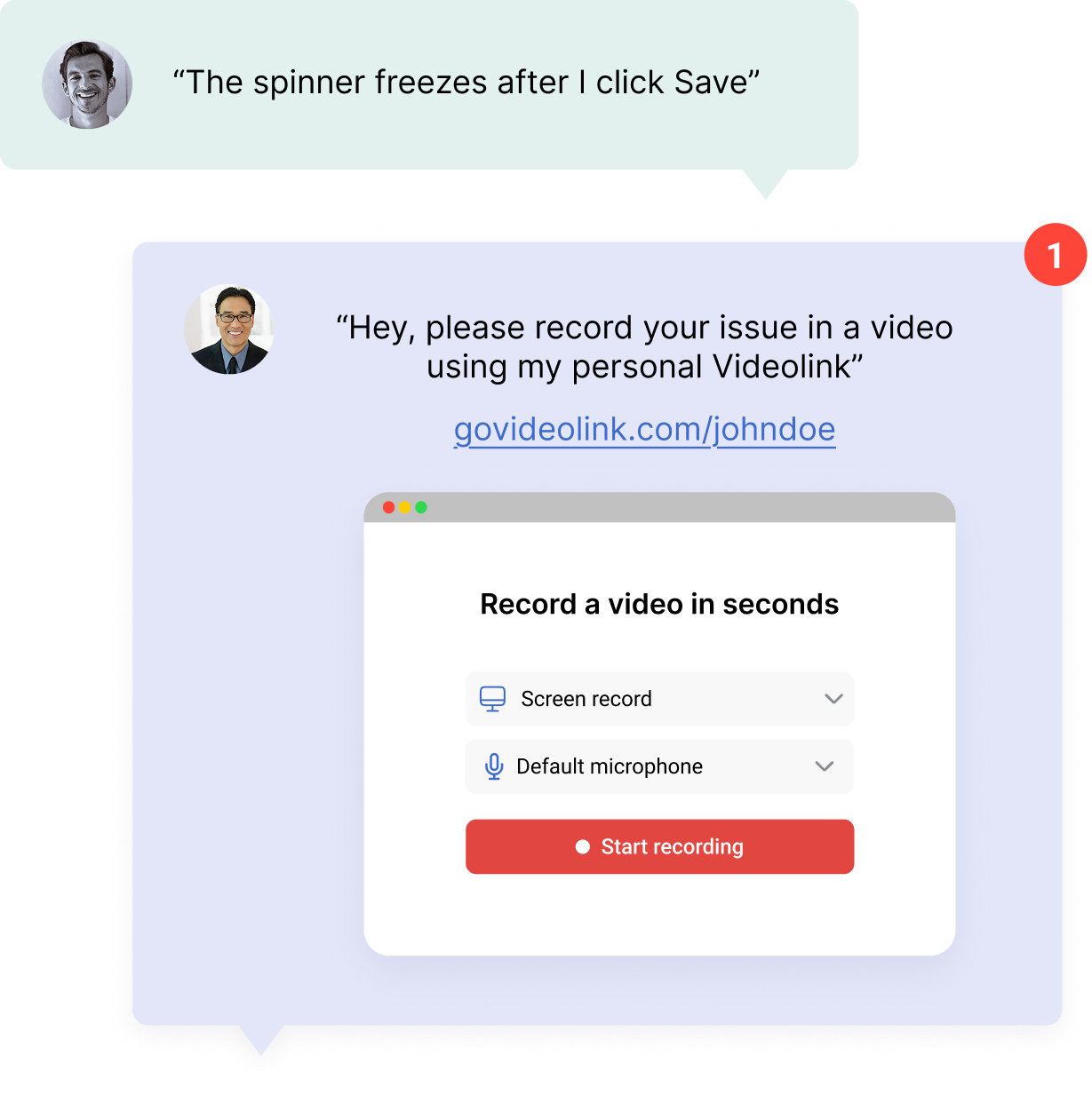 Show the problem instead of describing it. Videolink lets you record the bug once, attach it to the issue, and comment on the exact moment it breaks, so your team knows what went wrong.