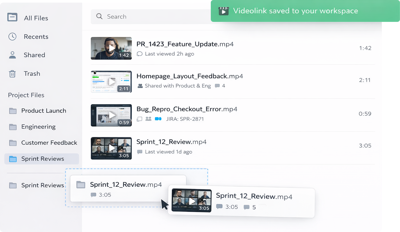 • Keep product updates, bug walkthroughs, and feedback videos organized